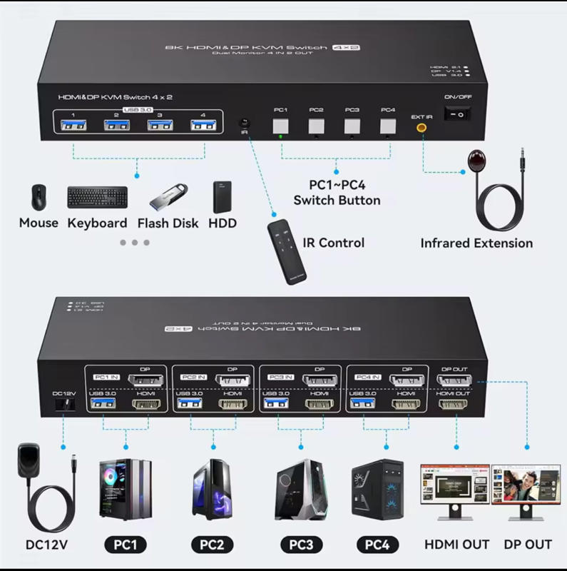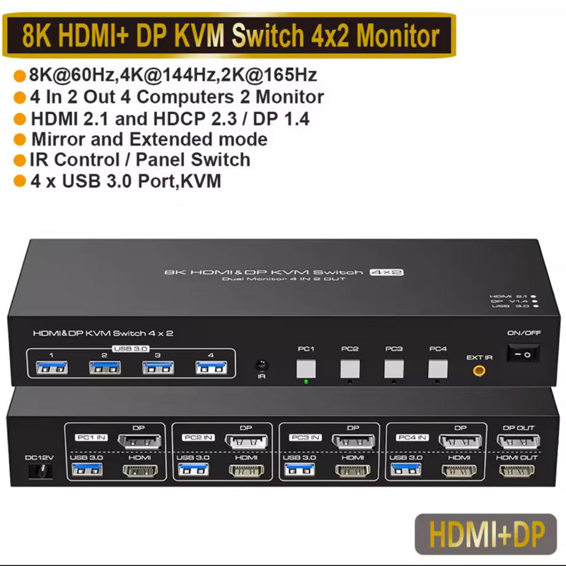 المنشأ: Mid in prc الحالة: Brand New الوصف: المنتج الموجود في الصورة هو مفتاح KVM (اختصار لـ Keyb... المنشأ: Mid in prc الحالة: Brand New الوصف: المنتج الموجود في الصورة هو مفتاح KVM (اختصار لـ Keyboard, Video, Mouse) بدقة 8K. يسمح هذا الجهاز بالتحكم في أجهزة كمبيوتر متعددة باستخدام لوحة مفاتيح وشاشة وماوس واحدة فقط. يحتوي المفتاح على مداخل ومخارج مزدوجة للشاشة، حيث يدعم 4 مداخل و 2 مخرج. يدعم المفتاح دقة 8K ويدعم منافذ HDMI 2.1 و DisplayPort (DP) V1.4. يمكن استخدامه لمشاركة لوحة مفاتيح وماوس وشاشة واحدة بين جهازي كمبيوتر أو أكثر. يتميز بوجود منافذ USB 3.0، مما يسمح بمشاركة الأجهزة الطرفية الأخرى مثل الطابعات أو محركات الأقراص بين الأجهزة المتصلة
