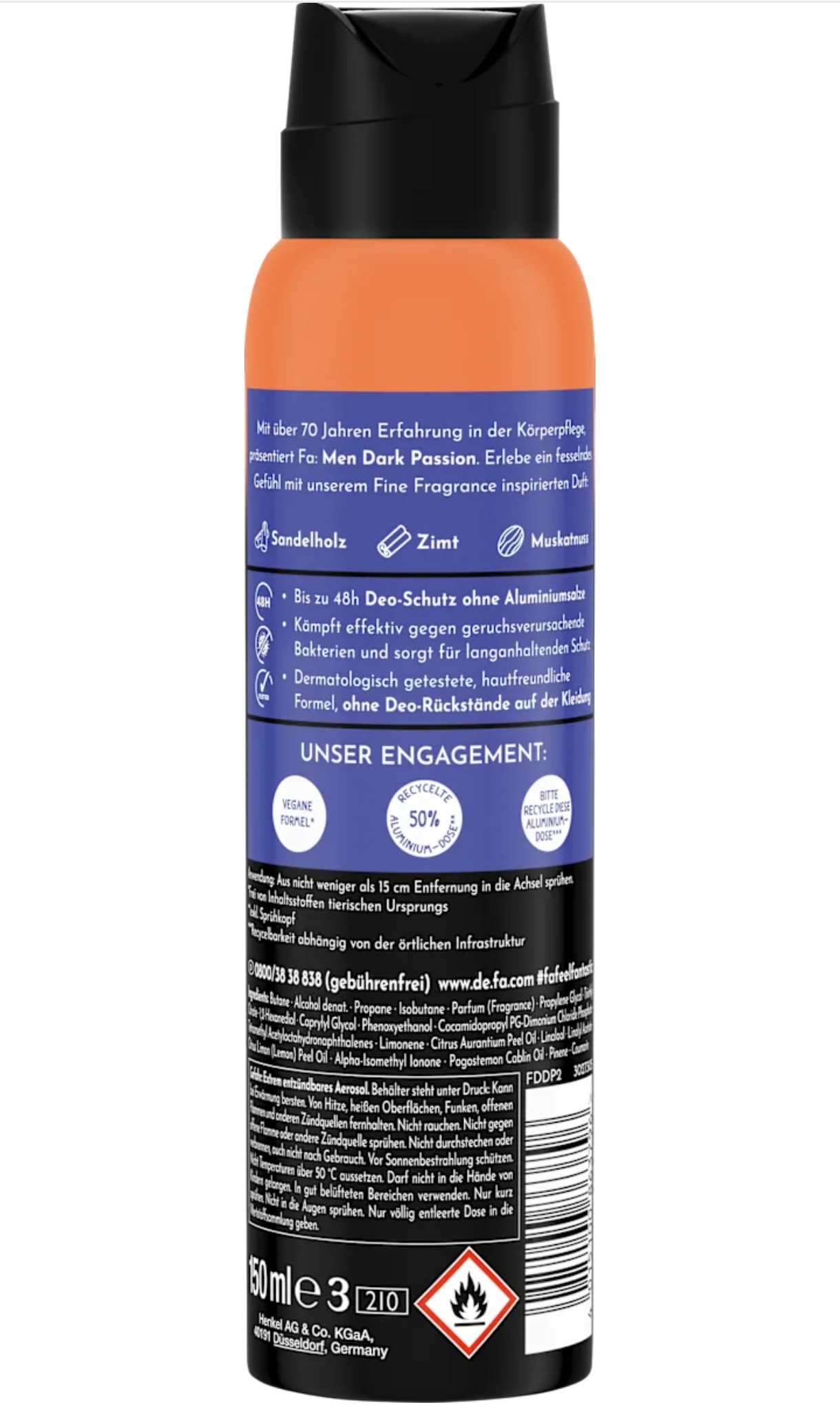 أطلق طاقتك وجاذبيتك مع Fa Men Dark Passion، مزيل العرق الذي يجمع بين العطر القوي والفخامة الحقيقية ب... أطلق طاقتك وجاذبيتك مع Fa Men Dark Passion، مزيل العرق الذي يجمع بين العطر القوي والفخامة الحقيقية برائحة خشب الصندل والدارسين وجوزة الطيب. تركيبة عصرية تمنحك حماية تدوم حتى 48 ساعة ضد الروائح، لتبقى منتعشًا وواثقًا طوال اليوم. 🔥 المميزات: عطر شرقي غني بنفحات خشب الصندل، القرفة، وجوزة الطيب لإطلالة رجولية قوية. حماية فعّالة حتى 48 ساعة بفضل التركيبة المضادة للبكتيريا. خالٍ من أملاح الألمنيوم، لطيف على البشرة ومناسب للاستخدام اليومي. لا يترك أي بقع أو آثار على الملابس. تركيبة نباتية (Vegan) مُختبرة جلديًا لضمان الأمان والراحة. 💪 النتيجة: انتعاش طويل الأمد برائحة رجولية جذابة تبقى في الذاكرة. مثالي للرجل العصري الذي يبحث عن حضور قوي وأناقة مستمرة. 🧡 السعة: 150 مل العلامة التجارية: Fa الفئة: للرجال