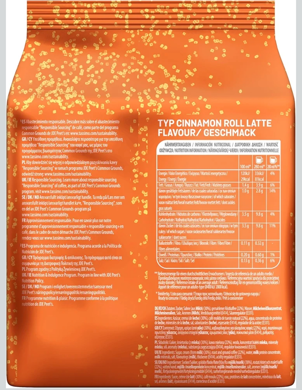 استمتع بمذاق القهوة الأوروبية الفاخرة مع تاسيمو لاتيه رول القرفة – إصدار محدود من أوروبا 🇪🇺. مزيج... استمتع بمذاق القهوة الأوروبية الفاخرة مع تاسيمو لاتيه رول القرفة – إصدار محدود من أوروبا 🇪🇺. مزيج لذيذ يجمع بين القهوة المحمصة المتوسطة وكريمة الحليب الغنية مع لمسة ناعمة من نكهة القرفة المستوحاة من لفائف القرفة الطازجة. يحتوي الكيس على 16 كبسولة (8 قهوة + 8 حليب) تكفي لتحضير 8 أكواب لاتيه كريمية جاهزة بضغطة زر واحدة عبر أجهزة Tassimo الأصلية. يتميز بطعم متوازن، قوام كريمي، ورائحة دافئة تبعث على الراحة. اختيار مثالي لمحبي النكهات الحلوة الفاخرة وتجربة المقهى داخل المنزل.