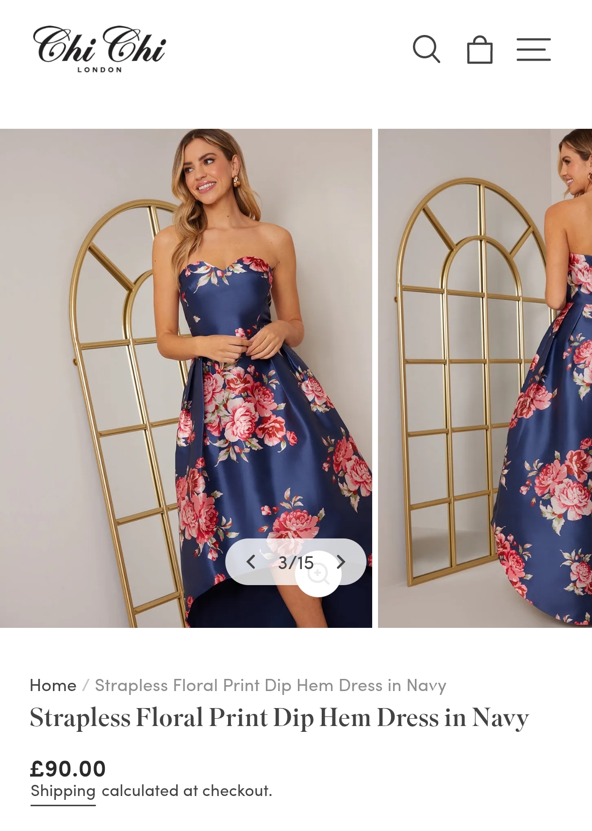 Chi Chi London – Strapless Floral Dip Hem Dress فستان سهرة بدون أكتاف بطبعة وردية قياس ٤٠ – كحلي